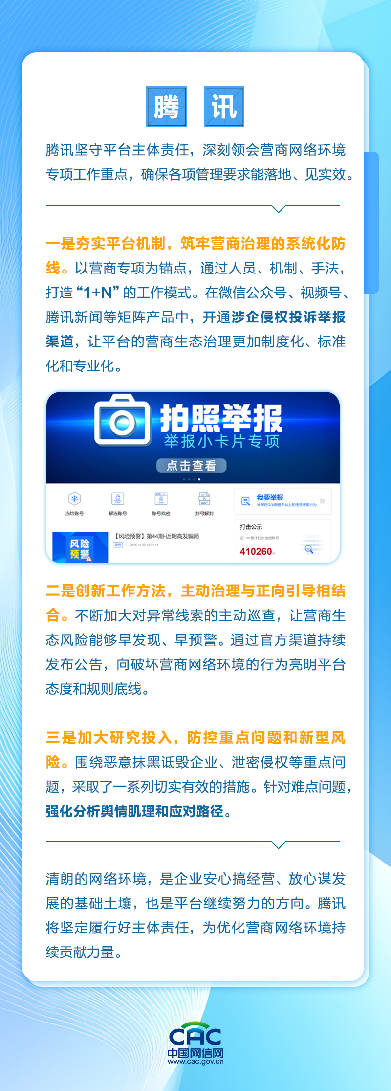 优化营商网络环境是优化营商环境的重要内容,也是网信部门的重要职责。近日,中央网信办在北京召开优化营商网络环境工作经验总结交流会。围绕优化营商网络环境工作,北京、上海、福建、四川等地网信办,以及微博、腾讯、抖音等平台,探索形成了一批好经验好做法。现将有关发言摘编如下,以供交流。