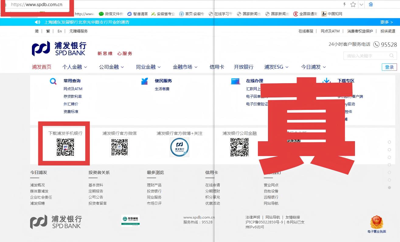 案例五:仿冒金融机构网站。不法分子使用仿冒的浦发银行官网骗取投资者信任,诱导投资者下载安装虚假App,实施非法荐股、非法配资等非法证券活动。